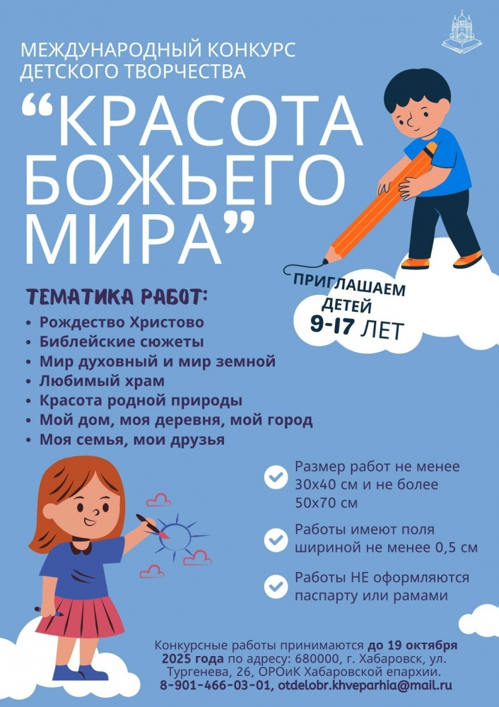 Конкурсные работы принимаются до 19 октября 2025 года лично или почтой по адресу: 680000, г. Хабаровск, ул. Тургенева д. 26, Отдел религиозного образования и катехизации Хабаровской епархии (тел. для справок: 8-901-466-03-01, e-mail: otdelobr.khveparhia@mail.ru).